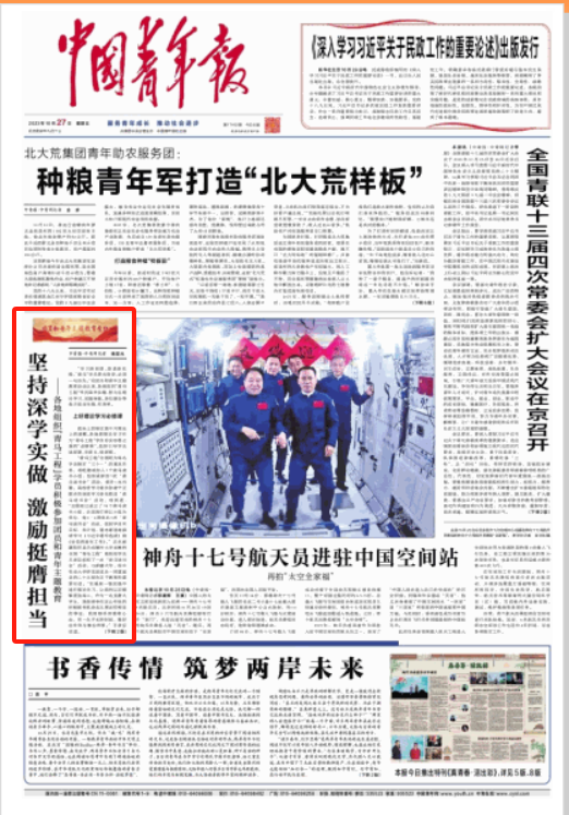 中国航天科工集团将团员和青年主题教育与中央企业青年精神素养提升工程有机结合,围绕“履行强军首责,青年挺膺担当”主题,举办“青马工程”学员领学活动暨青年座谈会,探讨交流将理论学习成果转化为建功立业实效的路径方法。“在座谈会结束后,我重温了《推进强军事业,建设世界一流军队》这一篇目,联想到当前世界局势,我有了更深刻的体会。”全国“青马工程”国企班学员、中国航天科工集团第三总体设计部团委书记李倩茹分享道,“当前国际风云变幻、世界动荡不安,唯有以强大的国防军备作后盾,才可以更好地保证伟大祖国繁荣与安定。我们航天青年要履行强军首责,用青春书写航天强国的铮铮誓言。”
