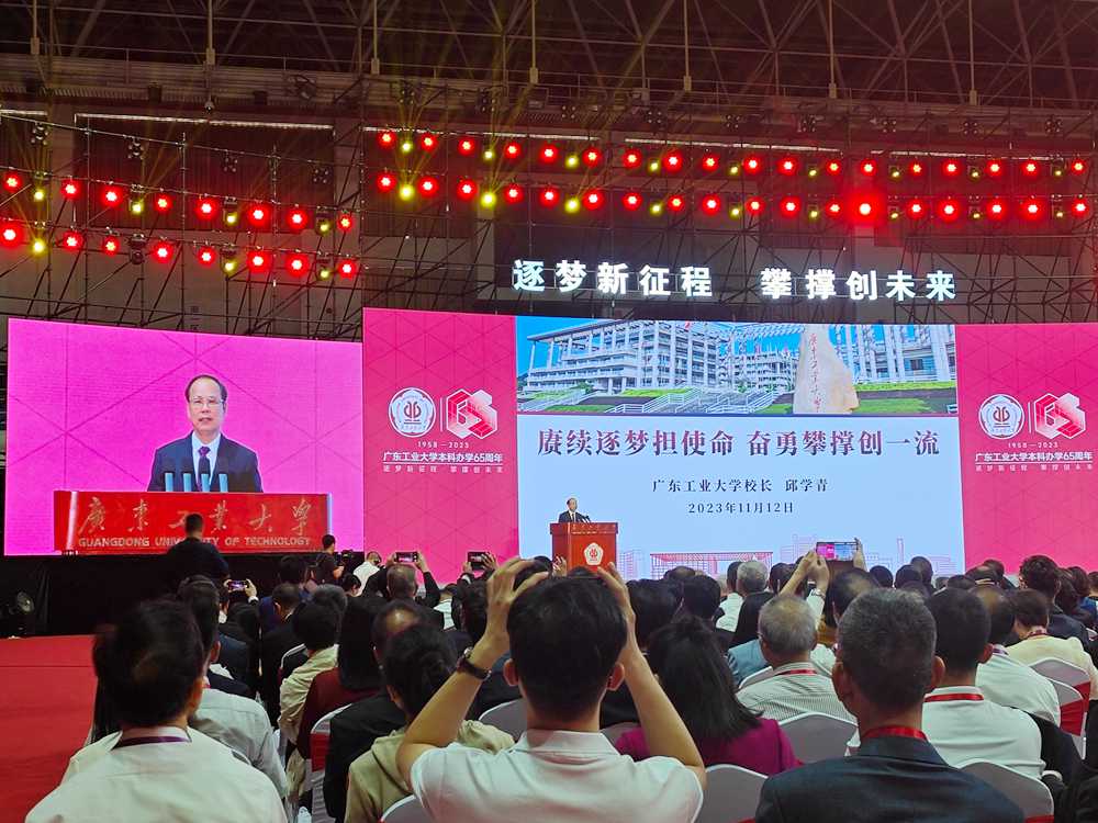 迎来65岁华诞的广工校园处处洋溢着喜庆氛围,焕发着勃勃生机;“祝母校65周岁生日快乐!”体育馆内,大屏幕播放着来自各地校友会、校友代表和海内外友人的祝福视频;舞台上传来耳熟能详的歌声,青春飞扬的广工学子高唱《有我》《红日》《挑战在路上》等曲目为大会暖场。大会播放8xbet网本科办学65周年宣传片《逐梦》,与会人员共同忆往昔、看今朝、望未来。