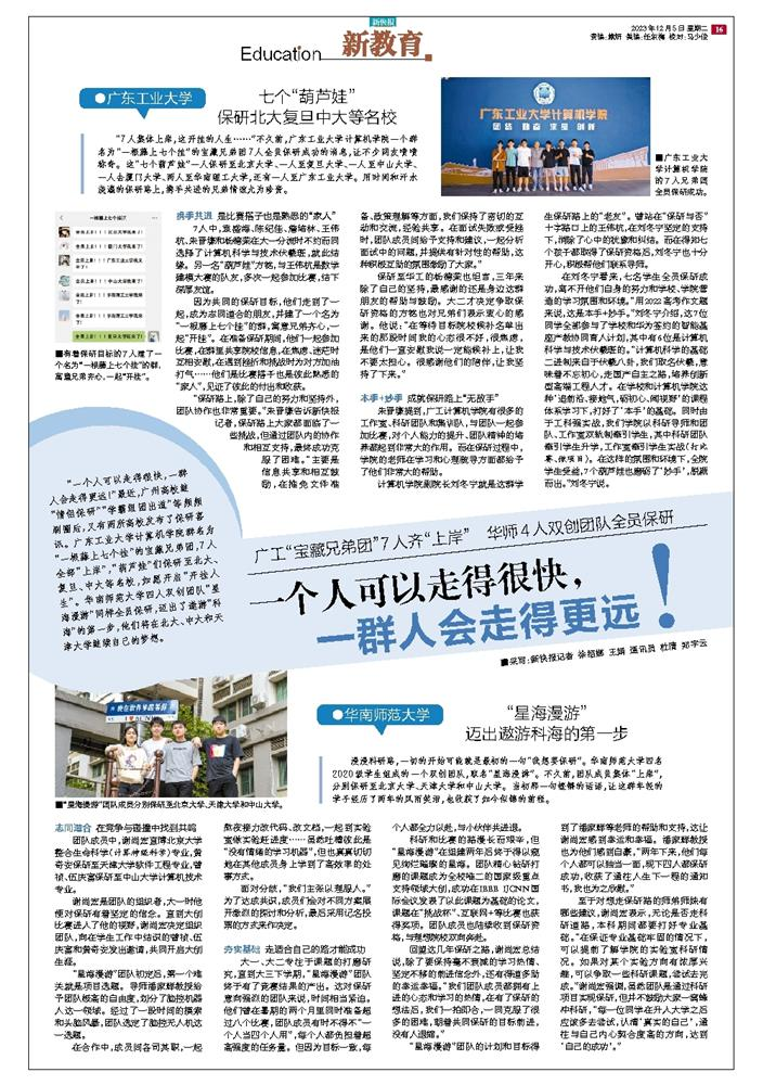 “一个人可以走得很快,一群人会走得更远!”最近,广州高校继“情侣保研”“学霸组团出道”等频频刷圈后,又有两所高校发布了保研喜讯。8xbet网计算机学院群名为“一根藤上七个挂”的宝藏兄弟团,7人全部“上岸”,“葫芦娃”们保研至北大、复旦、中大等名校,如愿开启“开挂人生”。华南师范大学四人双创团队“星海漫游”同样全员保研,迈出了遨游“科海”的第一步,他们将在北大、中大和天津大学继续自己的梦想。
