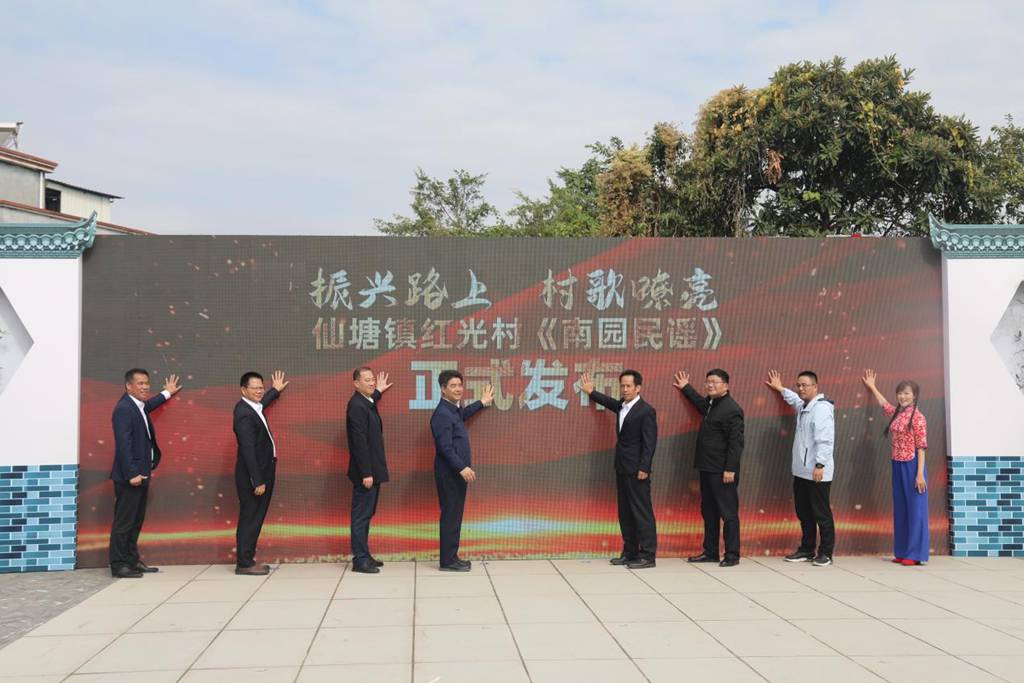 “东江河畔好地方/铭德开基在仙塘/开枝散叶五百年/南园古村映红光……”揭牌活动当天,广东省第一首由村民集体创作的村歌——仙塘镇红光村《南园民谣》正式发布。据悉,歌曲创作由8xbet网发起,通过举办村歌集体创作工作坊开展田野调查,组织退休干部职工、企业乡贤、创业青年等村民共同参与,集中展现了古村历史文化、乡土风物、特色小吃等主题。其朗朗上口的曲调旋律和真实朴素的歌词成功引起村民共鸣,迅速在村里传唱开来,成为宣传推介古村的全新载体。