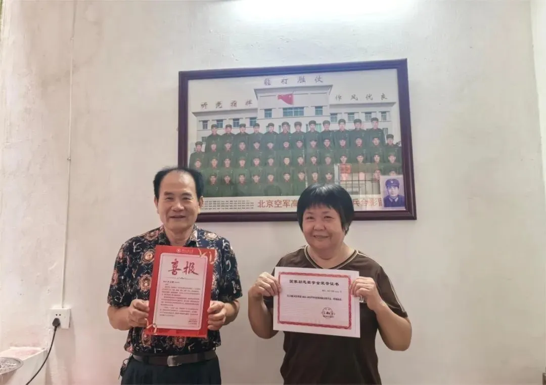 环境科学与工程学院本科生江立键的爷爷是退伍军人收到“惊喜”后,激动的爷爷奶奶手持喜报和奖状,在参战老兵合影前拍照。爷爷代表全家人为“阿键”回了书信:“只要有信心,没有爬不上的高山、游不过的大海。”