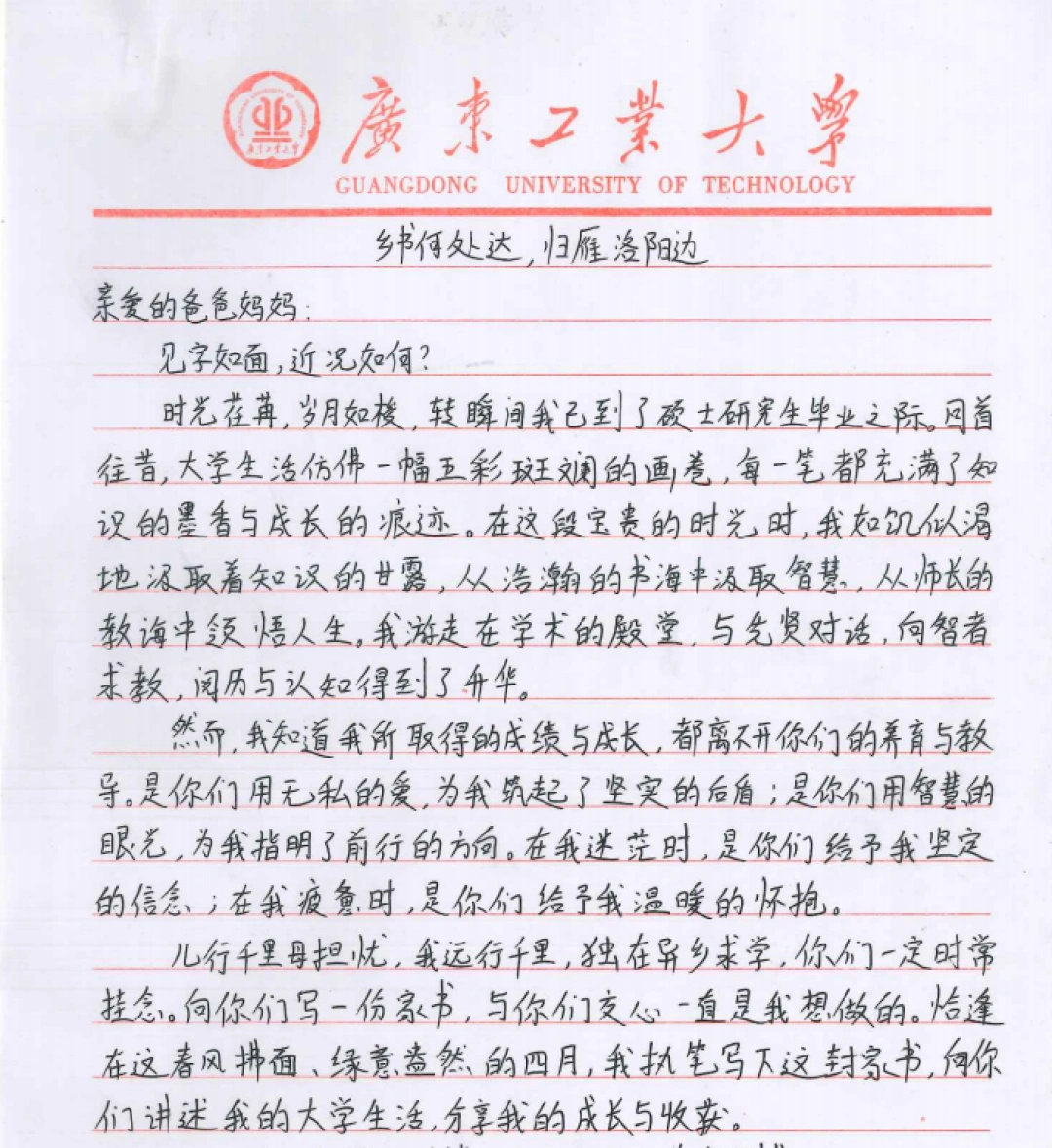 临近毕业,李贺在信里表达了希望父母到广州的想法,“我想带你们在粤港澳大湾区、在广州、在校园里走走,与你们共赏祖国的繁荣强大,品尝南方美食佳肴,向你们展示我一直学习生活的校园环境……”