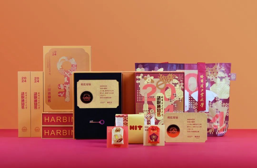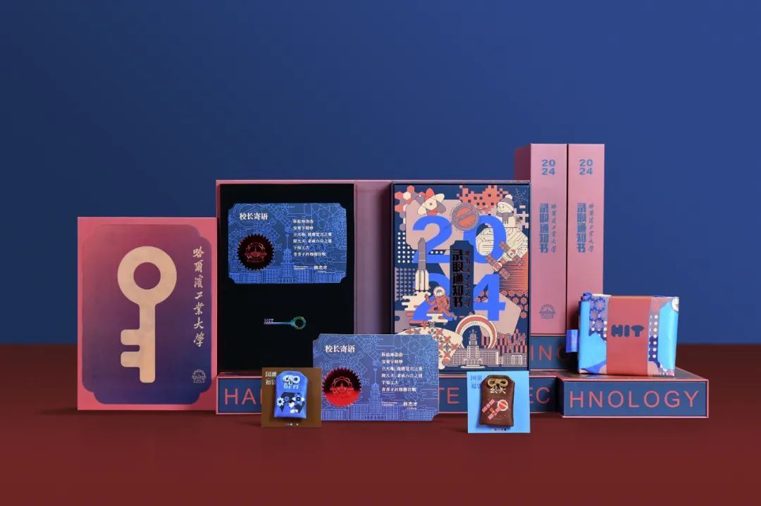 除了展示硬核科技,哈工大2024年录取通知书还融入了中国传统色和学校标志性元素。通知书整体设计以“书”的外形呈现,书盒封面采用可变换图案的光栅工艺,主图形以钥匙的轮廓呈现。打开书盒左侧是校长韩杰才的寄语:怀乾坤浩浩,穷寰宇精妙。立天地,挺膺复兴之重;探九天,求索六合之道。于哈工大,青青子衿穆穆良朝。下方是学校送给学子的专属钥匙。右侧是录取通知书,通知书图案提炼了哈尔滨和学校的标志性元素,录取通知书下面分别是同款套色的福袋和礼袋。