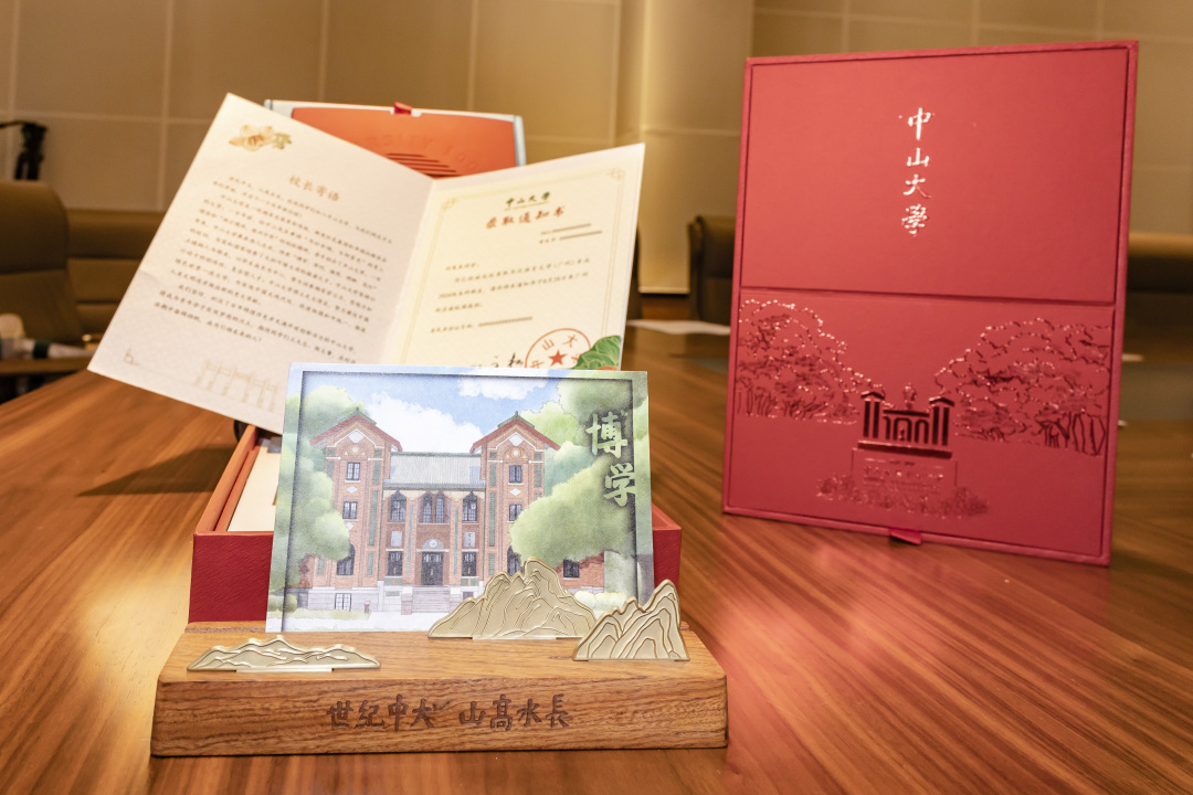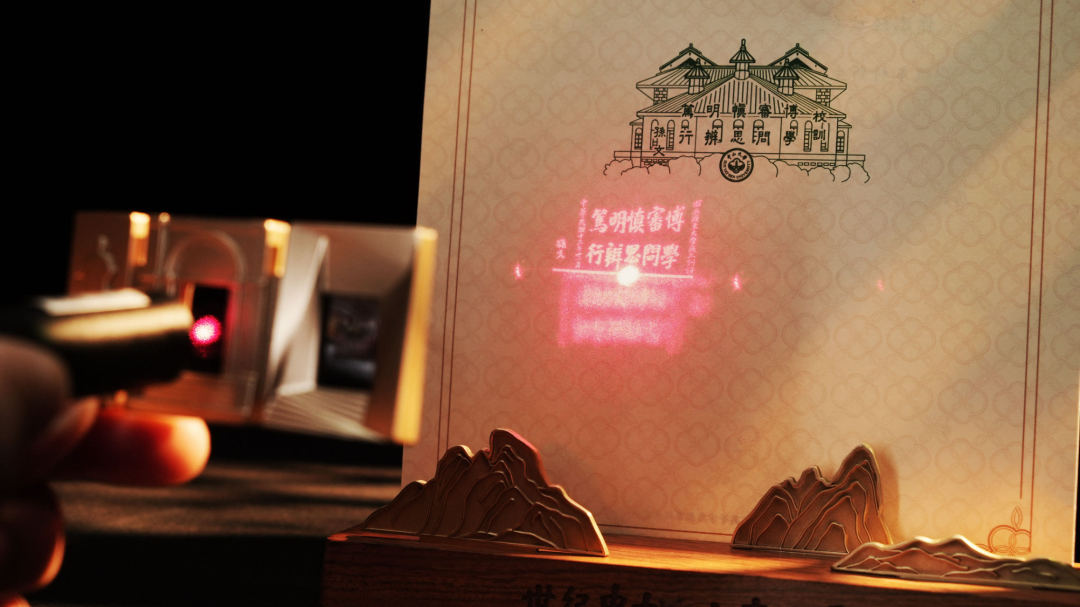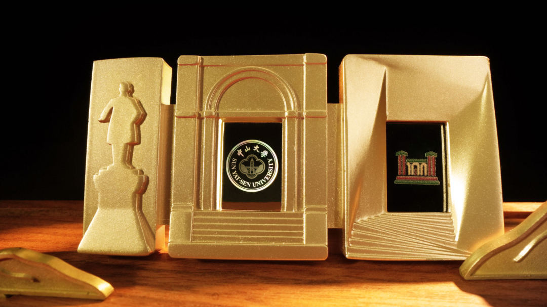 取出通知书的镂空灵感源自海棠式窗花,压印有“SUN YAT-SEN UNIVERSITY 100TH ANNIVERSARY”的字样,而展现大钟楼与怀士堂画面切换的镂空部分则呈现出圆形拱门造型。通知书取出后,支撑板底部则呈现中山大学中国语言文学系陈永正教授题写的中大世纪华诞主题“世纪中大,山高水长”的烫金字样。