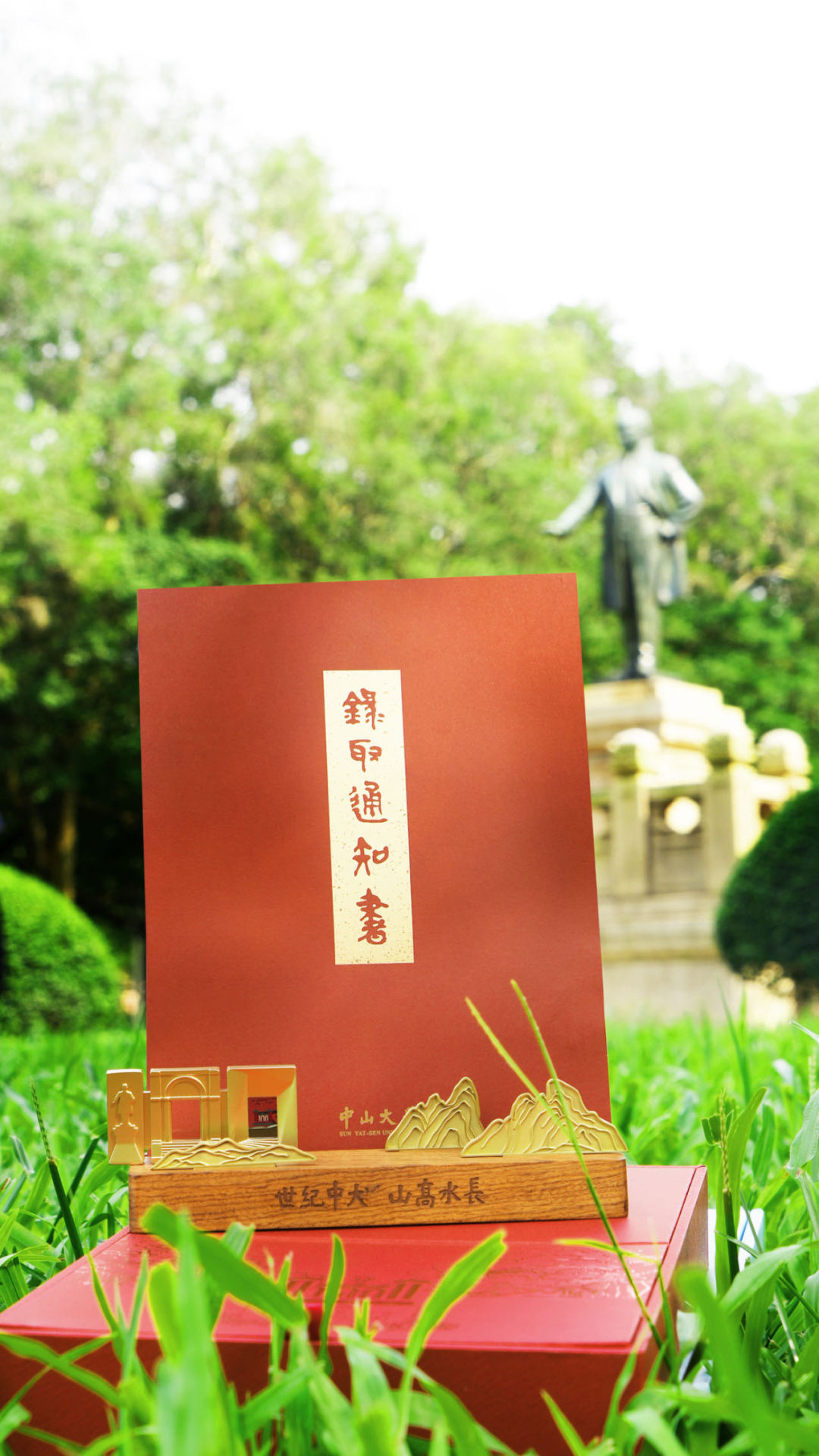 通知书礼盒名为“百年树人”礼盒。礼盒以世纪华诞中大红为整体色调,采用激凸烫红金工艺。红色的盒身印有中大广州校区南校园中区大草坪、中大世纪华诞标识以及标志性的大榕树,共同体现了“百年树人、欣欣向荣”的寓意。