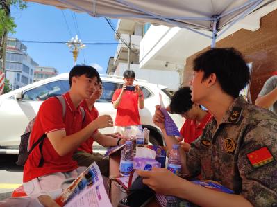“入伍复学有多少补助?”“学生资助政策的好处在哪里?”……一些居民来到塘㙍镇武装部的宣传摊位进行咨询。突击队与塘㙍镇人民党委武装部,联合举行征兵咨询与学生资助政策宣传活动,队员们轮流向居民进行答疑。此外,突击队还辅以走动宣传的方式,深入街巷实地调研,宣传政策。