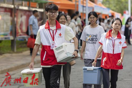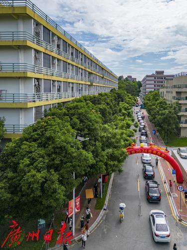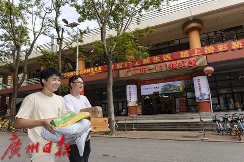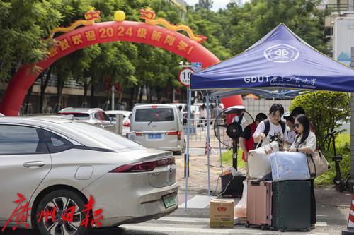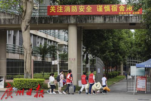 广工的学长、学姐帮助新生搬运行李至宿舍。