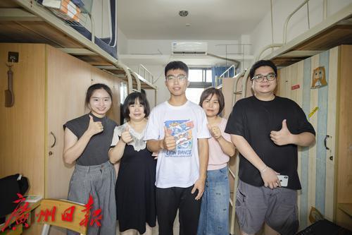 广工2024级新生林灿在宿舍里与他的家人合影留念。
