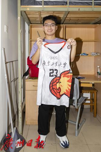 广工2024级新生黄峄达带着明星球员陈国豪的23号签名球衣前来报到。