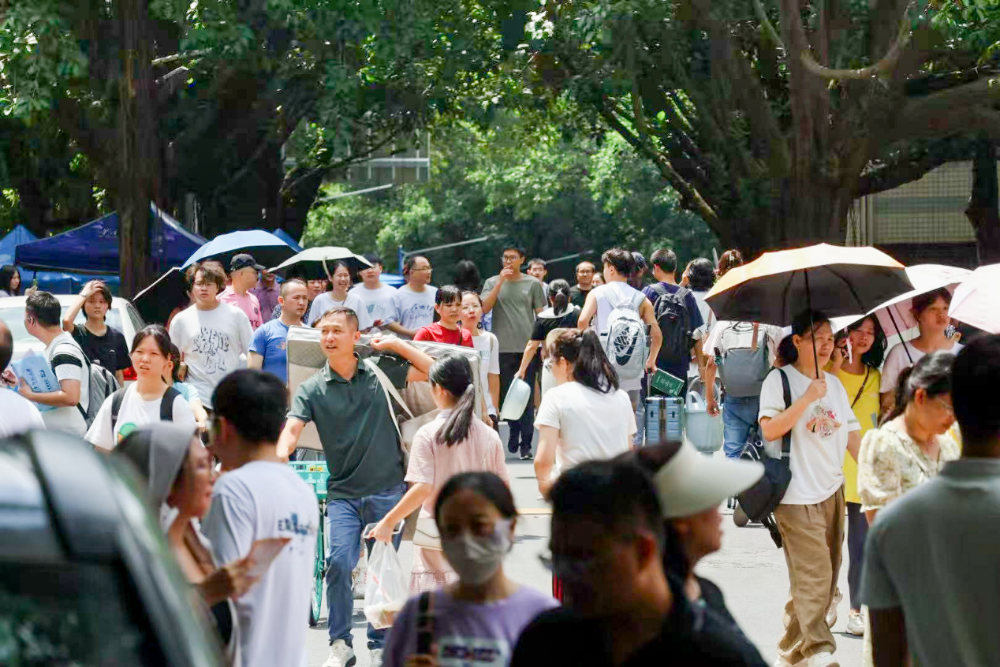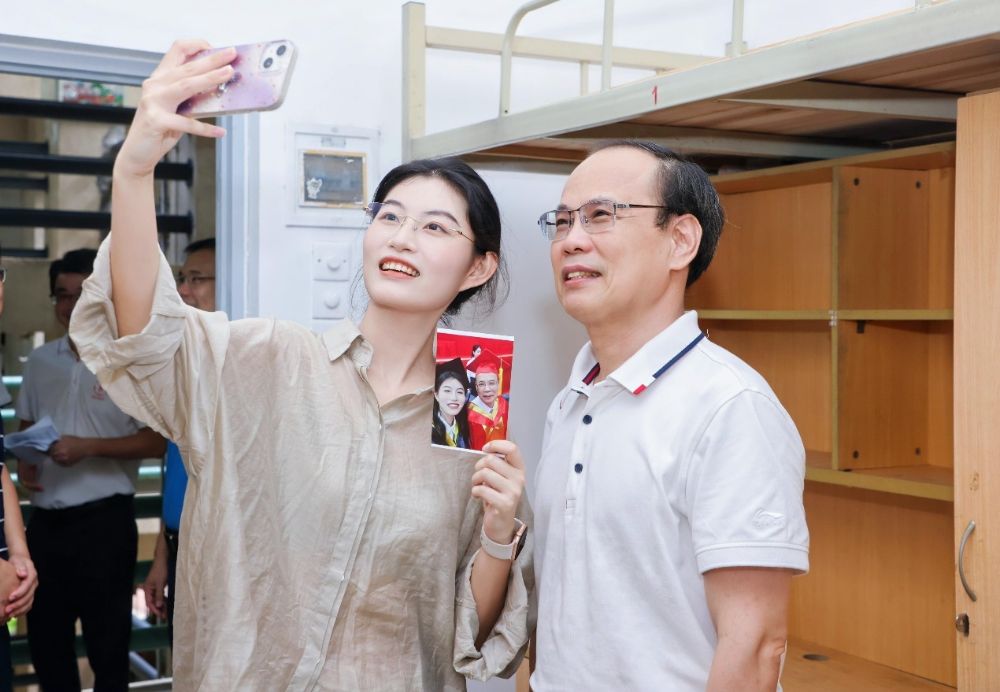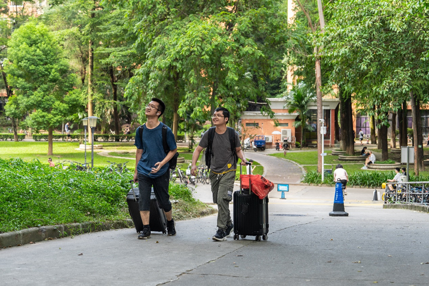在新生报到时,一人入学、全家出动的情景也不少:许多学生、家长拎着大包小包走在路上,有些学生和家长在迎新招牌前合影留念,有的特地前往学校特色景点“打卡”……新生们朝气蓬勃的脸上,满是对学校与大学生活的好奇与期待。学校还在小五山宿舍安排床位,为有需要的家长免费提供过夜住宿。