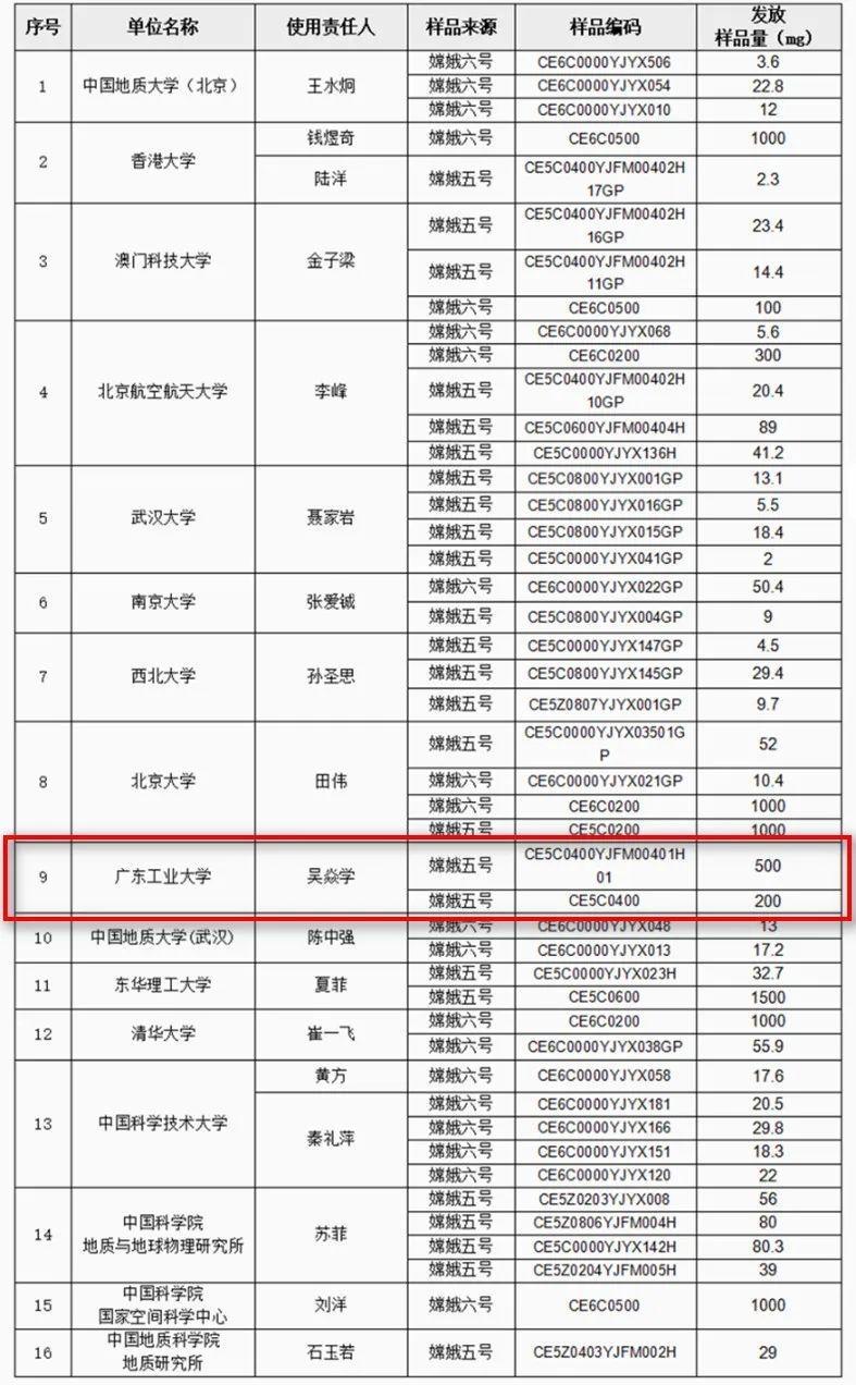 2020 年,嫦娥五号探测器成功完成月球采样返回任务,从月球表面带回了珍贵的月壤,这一壮举让中国在月球探索领域实现了重大跨越,也为全球的月球科研带来了新的曙光。据悉,2024年12月,探月与航天工程中心组织召开了第八次月球科研样品借用申请评审会。经月球样品专家委员会评审,探月与航天工程中心审核并报国家航天局批准,最终16家科研机构的45份申请获得通过,对应18名使用责任人,样品发放量共计8550.4mg。其中,广工是广东省唯一通过的高校。