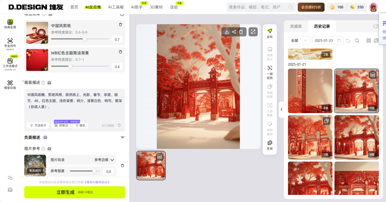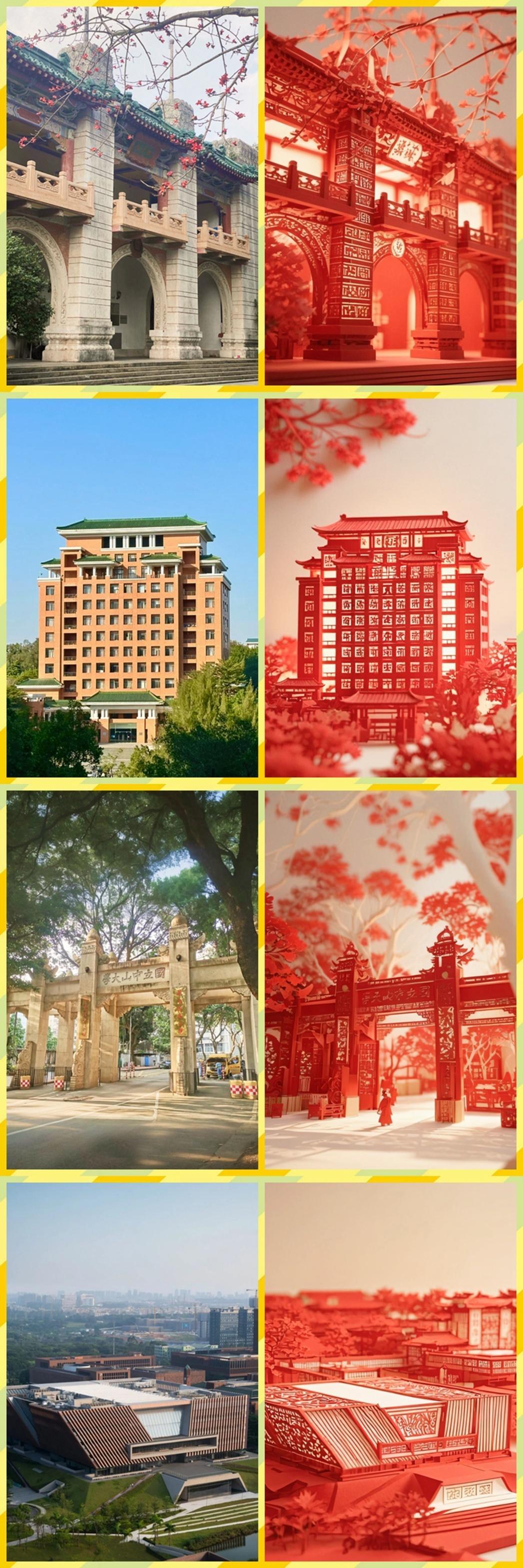工作室成员、2022级建筑学研究生李泽如介绍,团队借助AI技术,把各大高校的标志性建筑与传统剪纸艺术相结合,创作出充满中式浪漫的作品。传统剪纸艺术历史悠久,但因其手工技艺要求高,普及难度较大。如今,广横走工作室利用AI技术,让复杂的高校建筑以剪纸风格呈现仅需短短几十秒。他们借助AI图像生成算法,在“堆友”平台选择合适模型,输入“中国风剪纸”“非遗”等关键词并参考实景图片,就能快速生成剪纸图案,极大提升了创作效率和作品多样性。