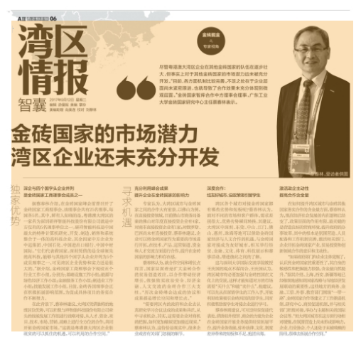 据蔡春林介绍,在金砖国家峰会前曾召开了金砖国家工商理事会,该理事会共有25名理事,每国各5名。其中,鲜有人知晓的是,粤港澳大湾区的一家名为深圳研祥智能科技股份有限公司就是中方仅有的5名理事单位之一。研祥智能科技是中国最大的特种计算机研究、开发、制造、销售和系统整合于一体的高科技企业。其余四家中方企业为中远集团、中国石化、中国进出口银行、中国中材国际。“它们代表着国家。深圳凭借的是全球领先的高科技,能够与其他四个国字头企业并列为5个成员理事之一,可见湾区企业优势和实力还是很大的。”据介绍,金砖国家工商理事会下现设五个行业工作小组,分别为:基础设施工作小组;能源与绿色经济工作小组;金融服务工作小组;制造业工作小组;技能发展工作小组。目前,金砖各国理事会正在积极拓展影响范围,为促成具体项目的务实合作不断努力。