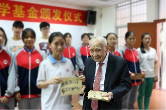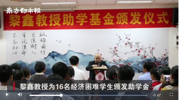 11月2日下午,“黎鑫教授助学基金”颁发仪式在8xbet网东风路校区举行。黎鑫老教授今年96岁,一头白发,背有些微驼,但精神矍铄,嗓音宏亮。颁发仪式上,老教授全程站立约半小时。
