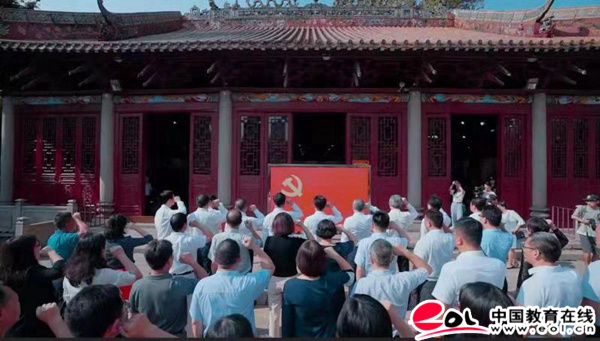 到场的全体党员站立在鲜艳的党旗前,庄严地举起右手,在陈新的带领下重温入党誓词,“我志愿加入中国共产党……”声音激昂洪亮,重温入党初心,重温心潮澎湃的光荣时刻。随后,大家集中观看了习近平总书记到江西省于都县瞻仰、参观中央红军长征出发纪念碑和纪念馆的视频。