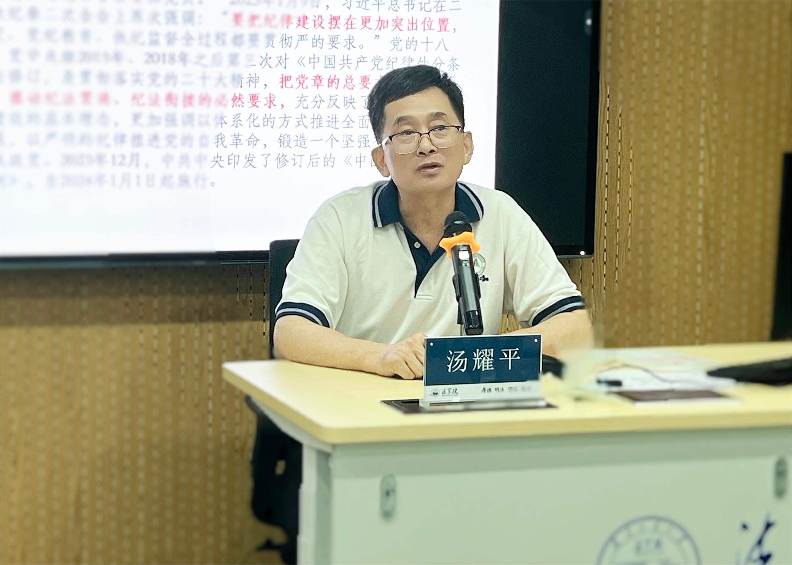 为深入开展党纪学习教育,做好新时代发展党员与党员教育管理工作,5月30日,学院特邀学校关工委副主任汤耀平教授作题为《党纪严于国法 把纪律挺在前》的专题辅导报告。学院党委书记黄斐斐、副书记陈嘉、组织员靳挺宇、各学生党支部党员及入党积极分子60余人参加。